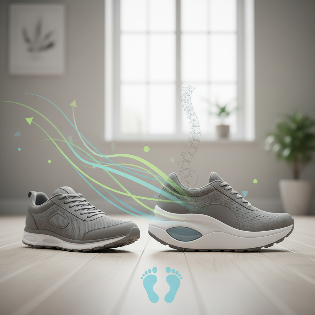 - Pagerinta laikysena: dėvint šiuos batus, kūnas natūraliai išlaiko taisyklingesnę poziciją, todėl mažėja nugaros skausmo rizika.