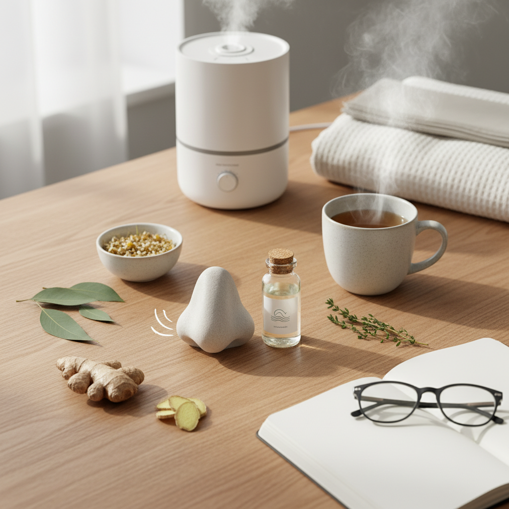 Eteriniai aliejai (eukaliptų, arbatmedžių, pušų) gali būti naudingi palengvinant kvėpavimą ir dezinfekuojant orą, tačiau juos reikia naudoti labai atsargiai. Juos galima garinti specialiose lempose arba lašinti kelis lašus į karšto vandens dubenį inhaliacijoms. Griežtai draudžiama eterinius aliejus tepti tiesiai ant nosies gleivinės ar lašinti į šnerves, nes jie gali sukelti stiprų nudegimą ir alergines reakcijas.